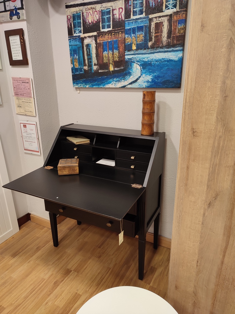 Escritorio con tapa abatible y 7 cajones en laca nedra envejecida .Con unas medidas de 85 x 41 de fondo x 100 de alto.