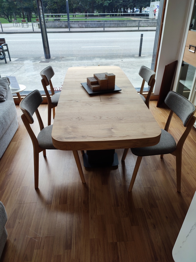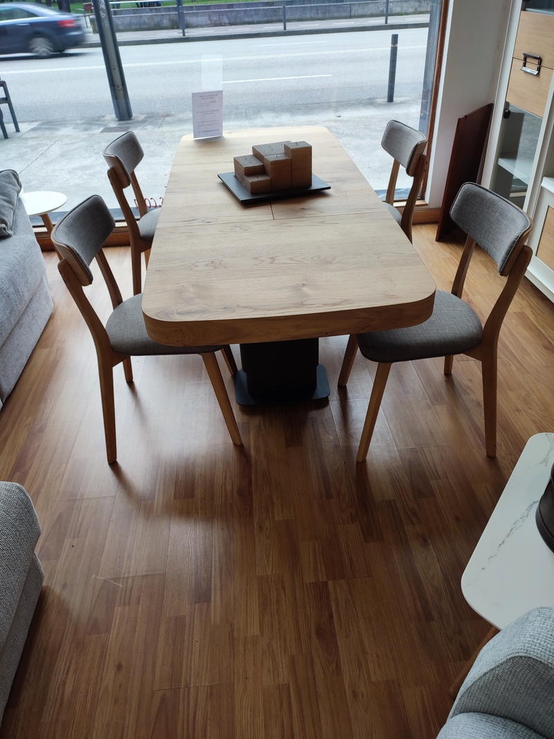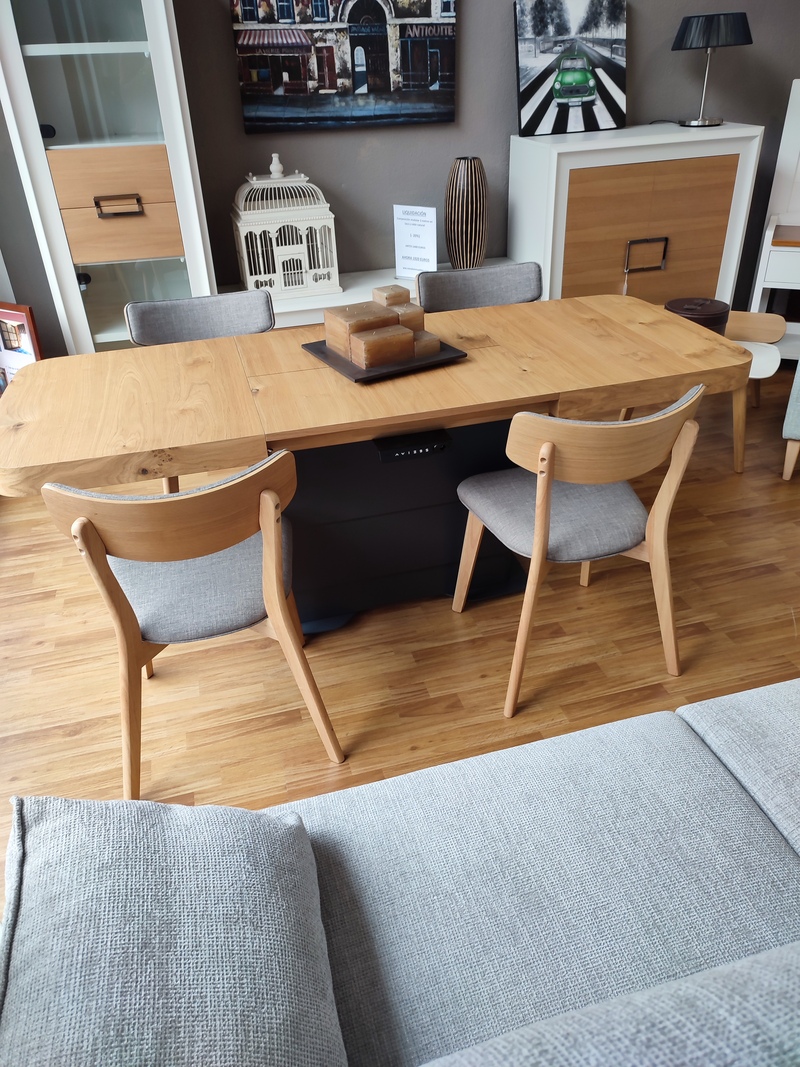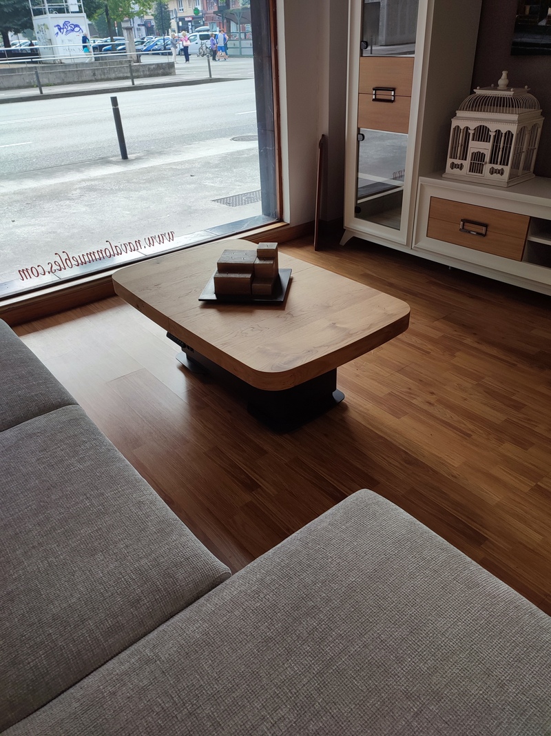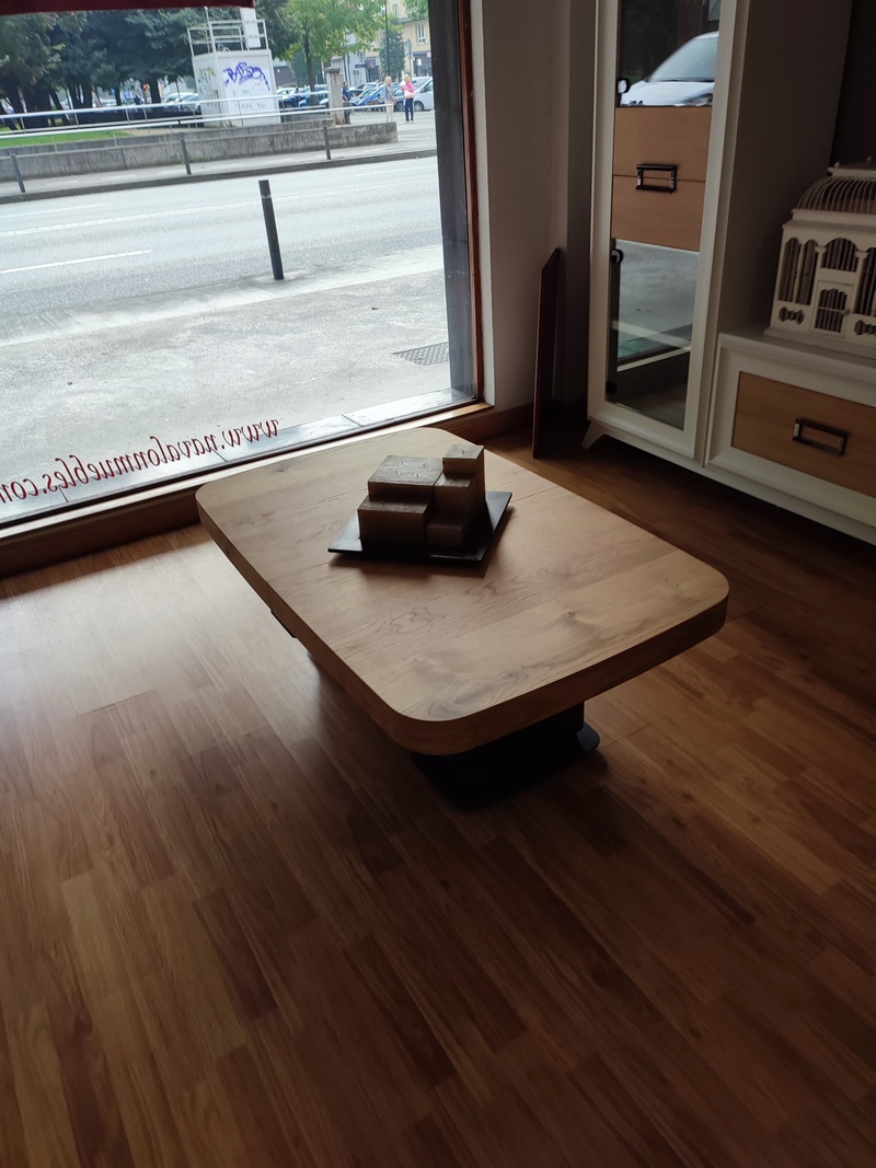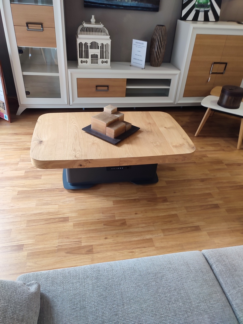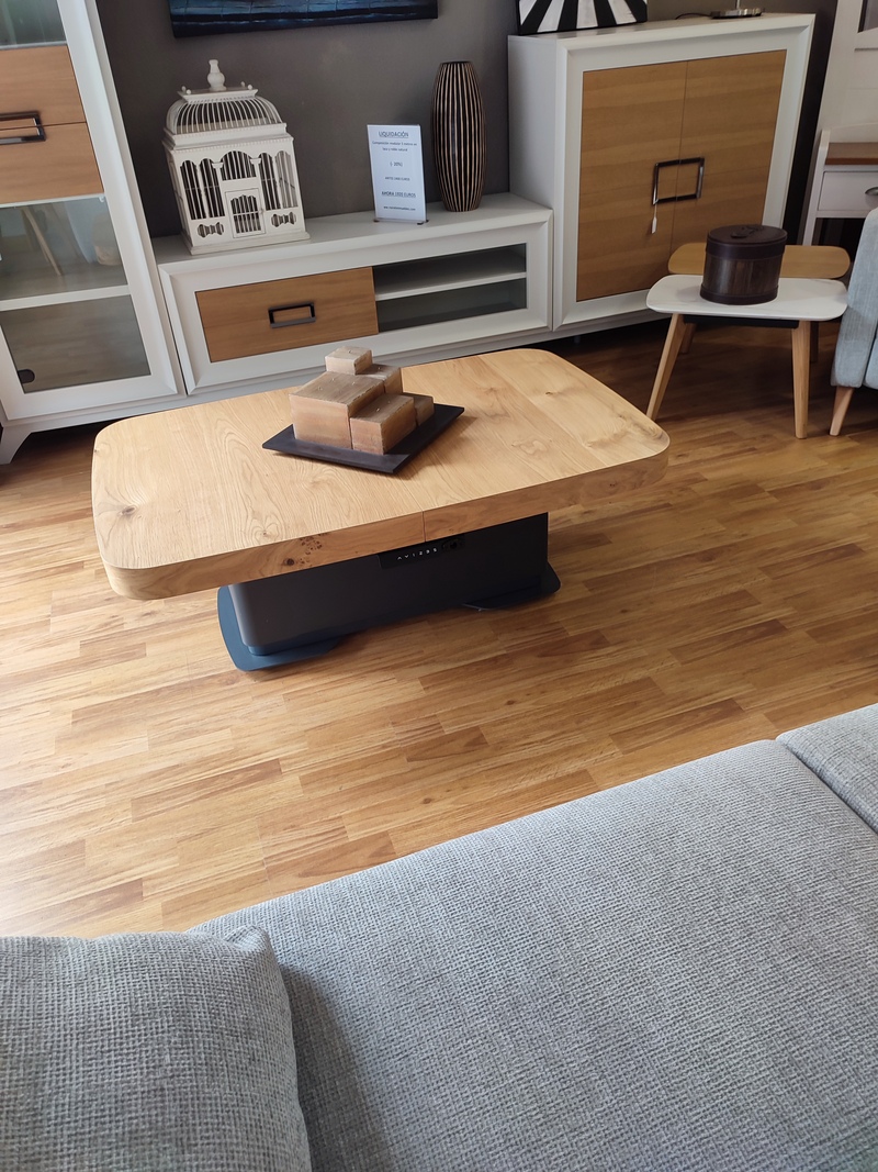 Disponible en tienda mesa de centro y comedor elevable con tapa en madera y pie central metálico con motor